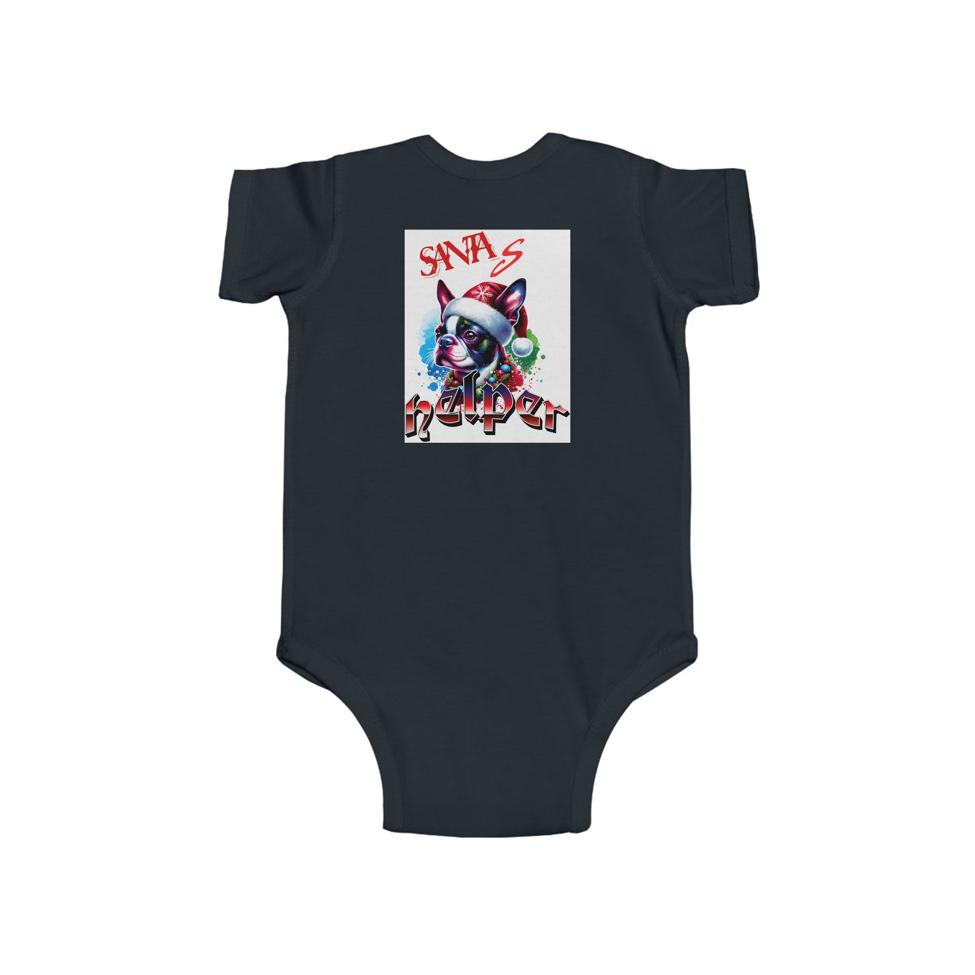 A soft, lightweight infant bodysuit printed with playful holiday-themed artwork — from a cheeky green character in a Santa hat to a colorful, punk-style pup decked out for winter. Made for little ones who get cozy during December, this bodysuit brings a fun, irreverent twist to seasonal baby wear. The fabric feels smooth against delicate skin and moves with baby thanks to ribbed knit binding and side seams that keep the shape through washes. Snap closures at the cross make diaper changes quick and fuss-free, while the tear-away label prevents irritation. REACH-certified materials and careful construction give parents confidence in garment safety and durability.